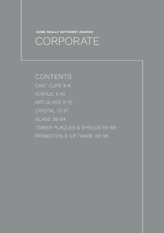 CRYSTAL SOME REALLY DIFFERENT AWARDS CORPORATE CONTENTS CAST CUPS 3-4 ACRYLIC 5-10 ART GLASS 11-12 CRYSTAL 13-37 GLASS 38-84 TIMBER PLAQUES & SHIELDS 85-88 PROMOTION & GIFTWARE 89-96 2 | CORPORATE COLLECTION