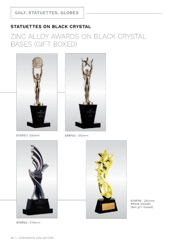 GOLF, STATUETTES, GLOBES STATUETTES ON BLACK CRYSTAL ZINC ALLOY AWARDS ON BLACK CRYSTAL BASES (GIFT BOXED) STAT01 | 330mm STAT02 | 310mm STAT05 | 250mm RESIN AWARD (Not gift boxed) STAT03 | 270mm 36 | CORPORATE COLLECTION