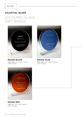 GLASS CELESTIAL GLASS COLOURED GLASS (GIFT BOXED) ROUND BLACK ROUND BLUE 1384-3BK | 210 x 200 x 45mm 1384-3BU | 210 x 200 x 45mm (10mm thick) (10mm thick) ROUND RED 1384-3R | 210 x 200 x 45mm (10mm thick) 58 | CORPORATE COLLECTION