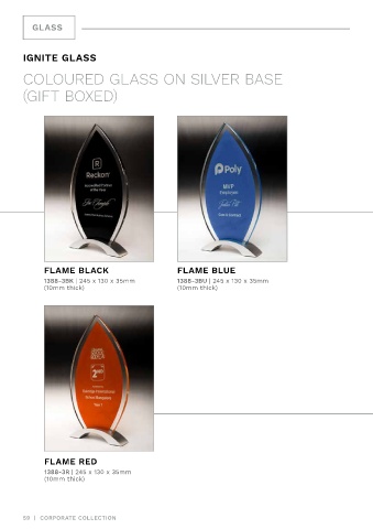 GLASS IGNITE GLASS COLOURED GLASS ON SILVER BASE (GIFT BOXED) FLAME BLACK FLAME BLUE 1388-3BK | 245 x 130 x 35mm 1388-3BU | 245 x 130 x 35mm (10mm thick) (10mm thick) FLAME RED 1388-3R | 245 x 130 x 35mm (10mm thick) 59 | CORPORATE COLLECTION