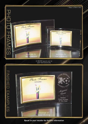 * Glass is 5mm thick KK316B-CL KK316A-CL 180 x 290mm 130 x 205mm All KK316 awards can be Laser Etched on only. Example of Laser Etching Speak to your retailer for further information 1717