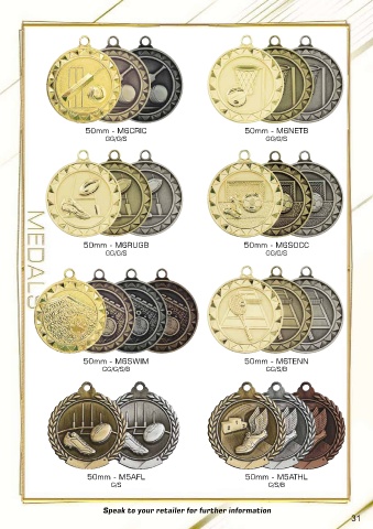 50mm - M6CRIC 50mm - M6NETB GG/G/S GG/G/S 50mm - M6RUGB 50mm - M6SOCC GG/G/S GG/G/S 50mm - M6SWIM 50mm - M6TENN GG/G/S/B GG/S/B 50mm - M5AFL 50mm - M5ATHL G/S G/S/B Speak to your retailer for further information 31