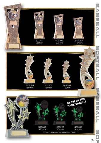 SC3301 SC3302 SC3303 BASEBALL 232mm 206mm 181mm SOFTBALL SC3304 SC3305 SC3306 214mm 189mm 169mm GLOW IN THE BASEBALL DARK TROPHY SC3307 SC3308 SC3309 175mm 152mm 134mm NIGHT VIEW OF TROPHIES GLOWING 33 SOF