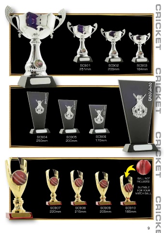 SC901 SC902 SC903 CRICKET 251mm 209mm 184mm CRICKET SC904 SC905 SC906 250mm 200mm 170mm CRICKET BALL NOT INCLUDED. SUITABLE FOR YOUR MATCH BALL. SC907 SC908 SC909 SC910 220mm 215mm 205mm 185mm CRICKE 9