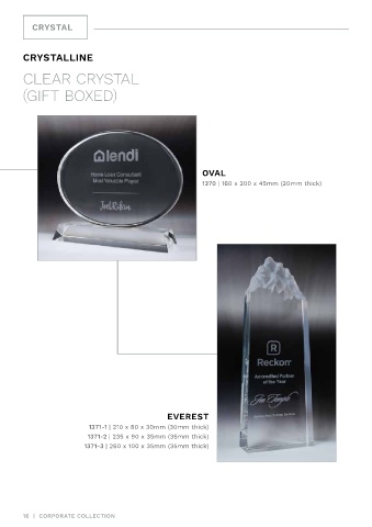 CRYSTAL CRYSTALLINE CLEAR CRYSTAL (GIFT BOXED) OVAL 1370 | 160 x 200 x 45mm (20mm thick) EVEREST 1371-1 | 210 x 80 x 30mm (30mm thick) 1371-2 | 235 x 90 x 35mm (35mm thick) 1371-3 | 260 x 100 x 35mm (35mm thick) 16 | CORPORATE COLLECTION