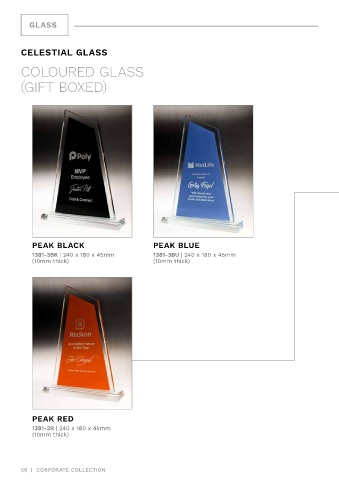 GLASS CELESTIAL GLASS COLOURED GLASS (GIFT BOXED) PEAK BLACK PEAK BLUE 1381-3BK | 240 x 180 x 45mm 1381-3BU | 240 x 180 x 45mm (10mm thick) (10mm thick) PEAK RED 1381-3R | 240 x 180 x 45mm (10mm thick) 56 | CORPORATE COLLECTION