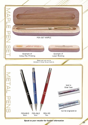 PEN SET MAPLE Example of Example of Colour-Tec Printing Laser Etching Maple pen set can be Etched or Colour-Tec printed on. Sold in Clear Case Can be engraved on PEN-BKS PEN-BLS PEN-RS Black Blue Red Speak to your retailer for further information 29