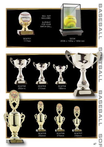 BALL NOT INCLUDED. SUITABLE BASEBALL FOR YOUR MATCH BALL. SC4701 DC04 117mm 203h x 140w x 140d mm SC4702 SC4703 SC4704 SOFTBALL 250mm 210mm 185mm BASEBALL SC4705 SC4706 SC4707 293mm 270mm 243mm 47 SOF